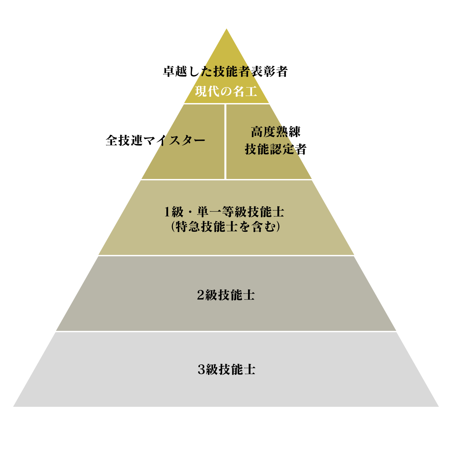 厚生労働大臣がきわめて優れた技能を有する方や技能を通じて働く人々の 福祉の増進及び産業の発展に寄与した方などを卓越した技能者(現代の 名工)として表彰しておりますが、全技連マイスターはその下位に位置づけて おります。